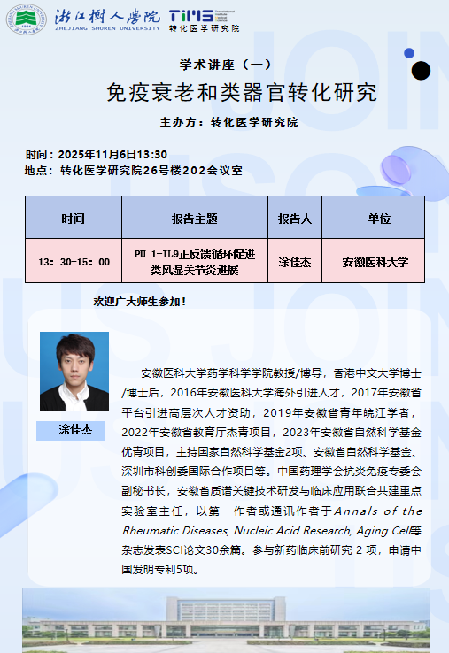 11月6日, 安徽医科大学药学科学学院教授、博士生导师涂佳杰教授应邀来院开展”免疫衰老和类器官转化研究”主题前沿学术讲座。本次讲座由校发展规划和学科建设处处长、树兰国际医学院副院长兼转化医学研究院院长史丽云教授主持,近40位师生到场聆听报告。