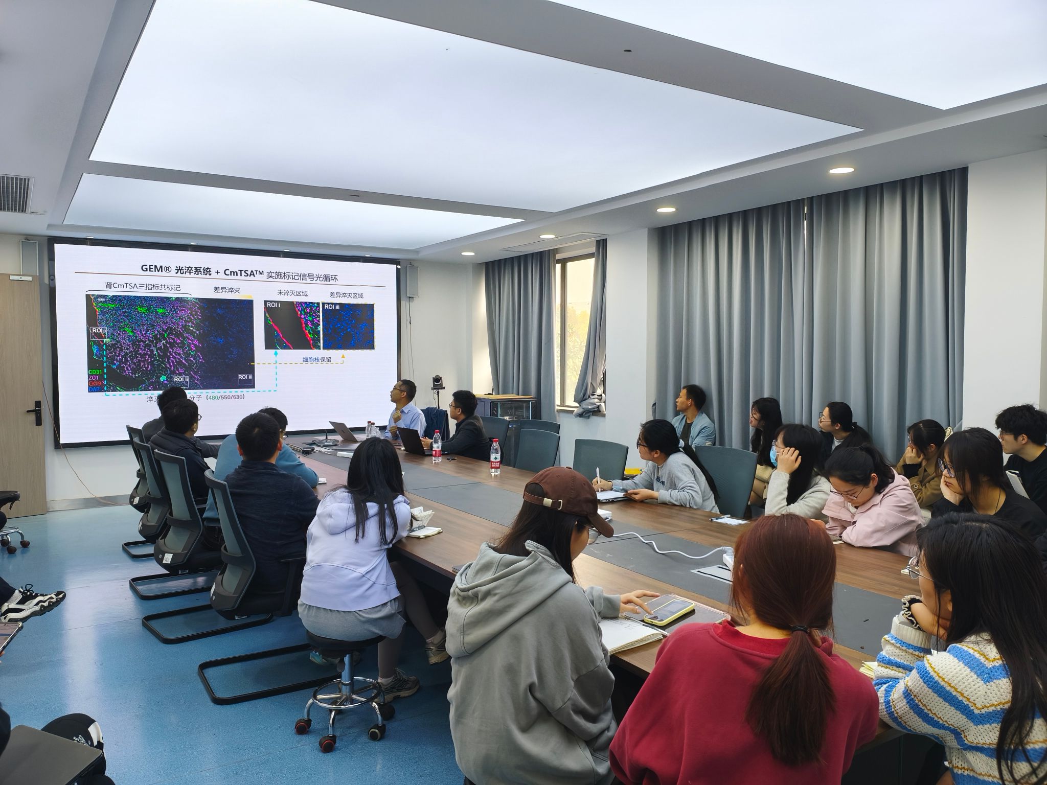 针对传统IF、TSA等技术长期存在的样本自发背景荧光干扰、抗体标记通量低(<9标)等瓶颈,赵教授重点讲解了自主研发的CmTSA技术通过光循环实现的两大核心突破:高效淬灭样本自发背景荧光,显著提升荧光成像信噪比;依托优化的CmTSA增强荧光标记,实现单张样本30余种蛋白共定位信号扩增标记。整场报告深入浅出,将前沿科研进展与医疗实践紧密结合,既有理论高度,又具应用导向。