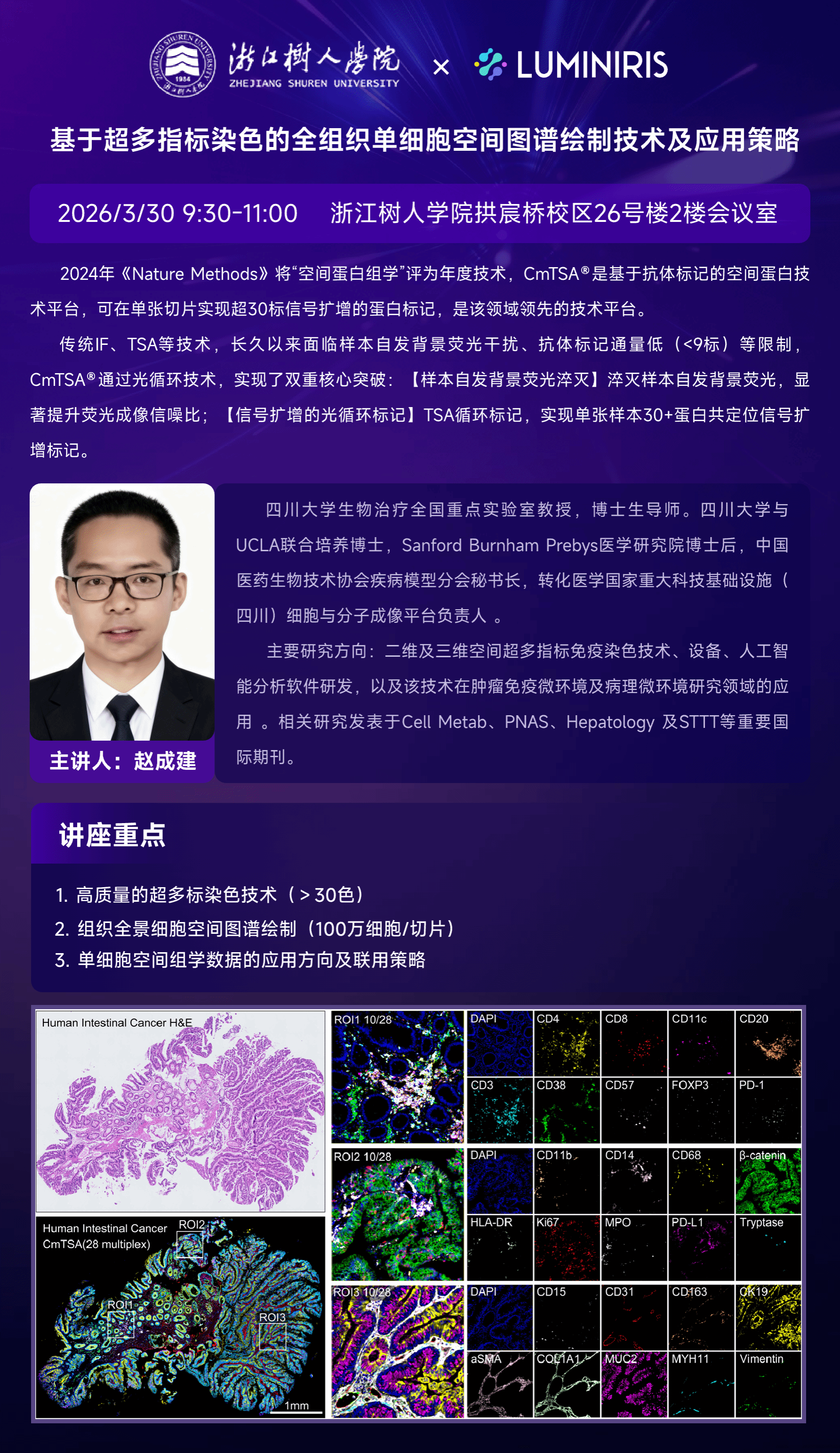 空间组学技术正成为解码组织微环境、揭示细胞间互作的核心利器,正推动基础研究向精准医学临床决策加速转化。作为该领域的先行者,赵成建教授长期致力于超多指标染色技术、计算机视觉AI分析技术与单细胞蛋白空间组学分析技术的融合创新,其领衔的转化医学国家重大科技基础设施(四川)分子与细胞成像平台,已成为推动医工交叉研究的重要基地。